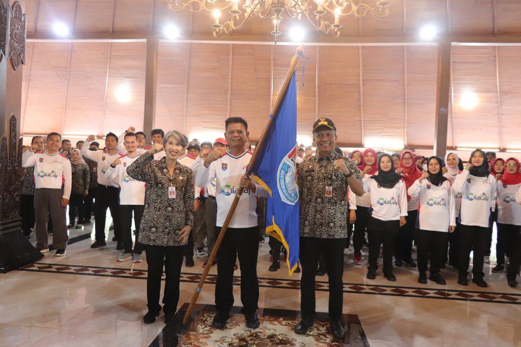 Pelepasan ditutup dengan penyerahan bendera Pataka oleh Pj. Bupati dan Sekretaris Daerah kepada manajer atlet, Agung Widodo. (RLS)