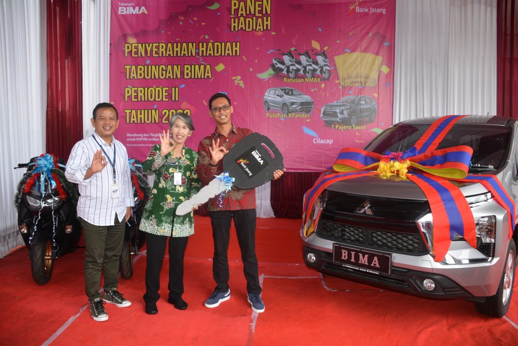RILISJATENG.COM– Penjabat Bupati Cilacap Yunita Dyah Suminar menyerahkan hadiah utama undian Tabungan Bima Tahap II Tahun 2022 dari Bank Jateng, berupa satu unit mobil Mitshubishi Xpander. Penyerahan dilakukan secara simbolis di Kantor Bank Jateng Cabang Cilacap, Jumat (23/6/2023).